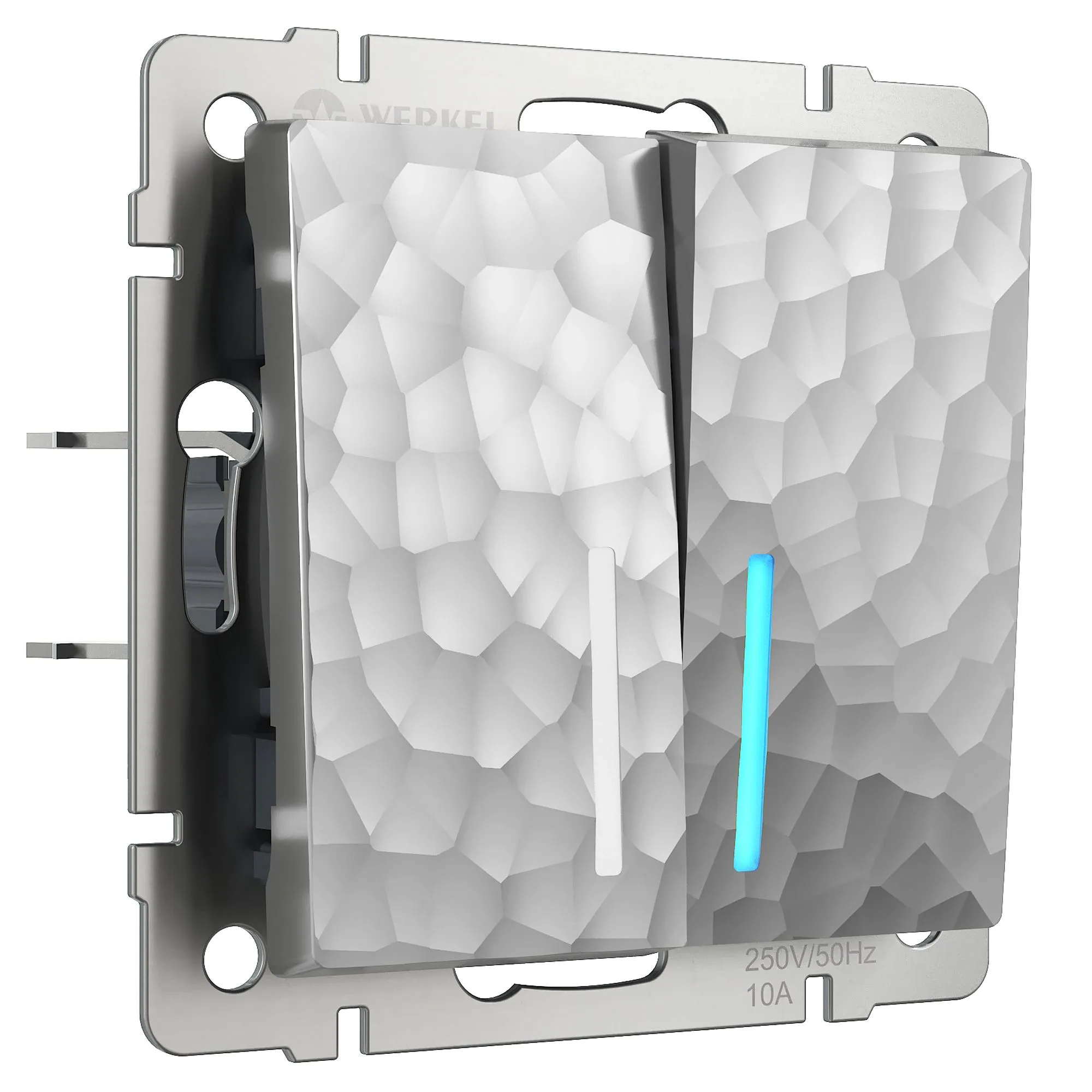 Современное и удобное решение для умного дома — проходной 2-клавишный выключатель с подсветкой Werkel W1222106 в серебряном  цвете. Предназначен для управления одним источником света с двух или более мест, а встроенная белая светодиодная подсветка обеспечивает лёгкое обнаружение прибора в темноте — идеально для коридоров, лестниц, спален и прихожих.