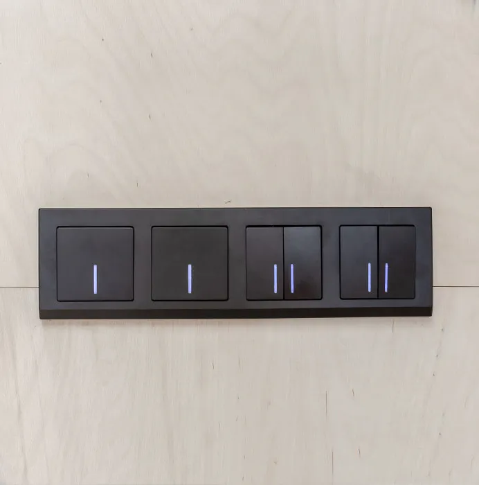 Для электроустановочных изделий дизайнеры выбрали рамки и механизмы марки Werkel™. Черные рамки серии Stark с аккуратными и строгими формами стали идеальным дополнением интерьера. Их классический универсальный черный цвет гармонично разбавил зеленую гамму кухни и фанерный фасад столовой, подчеркивая современный характер дизайна.