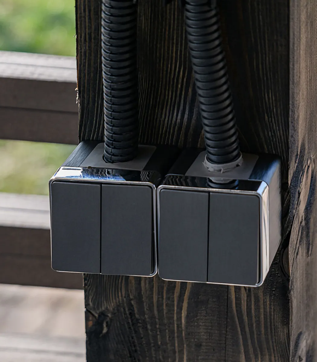 Беседка получила современный облик, где особое внимание уделили функциональности и эстетике. Стены украсили накладные розетки и выключатели Werkel™ из серии Gallant в выразительном цвете рифленый графит. Эти механизмы не только гармонично вписались в интерьер, но и стали его ярким акцентом благодаря фактурной поверхности, имитирующей шлифованный металл, и оригинальной хромированной декоративной вставке.