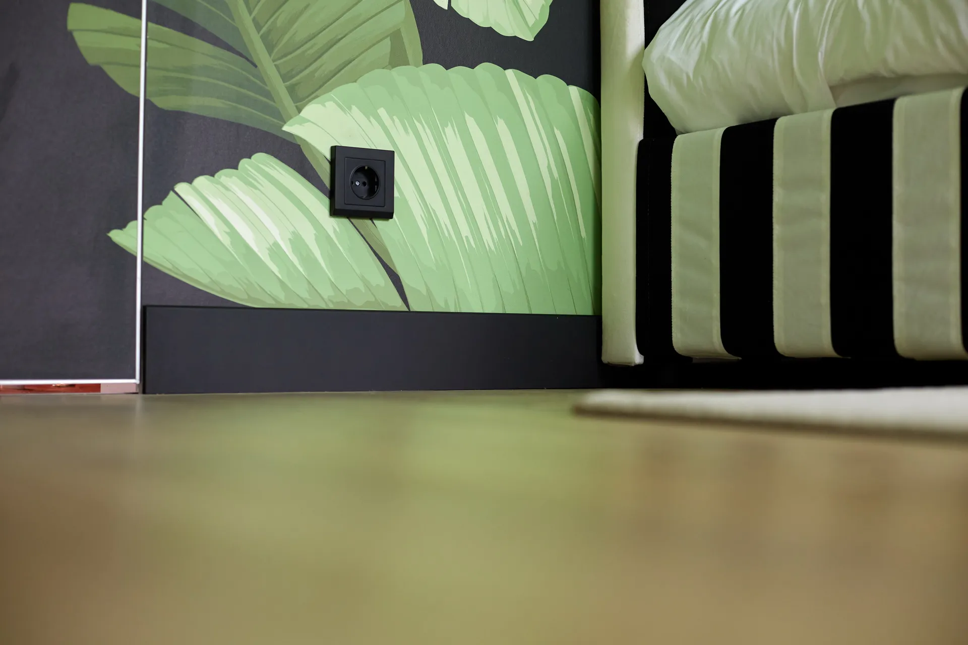 Обновленную детскую дополнили электроустановочные изделия Werkel™. На стенах разместились розетки и выключатели в черном матовом цвете, обрамленные строгими рамками из серии Stark. Эти детали не только выполнили свою функцию, но и стали стильным дополнением интерьера, гармонируя с общим настроением "джунглей" .