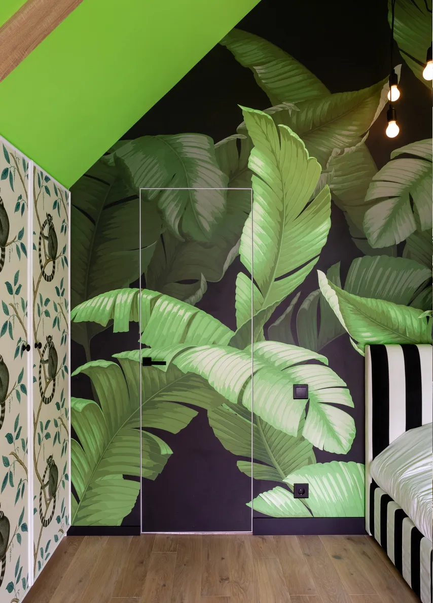 Интерьер наполнился жизнерадостными деталями: по потолку "пробежали" лианы, а на стенах появились забавные мартышки и зебры. Важным элементом стал домик для "домашнего дракона", который добавил игривости пространству. Дизайнеры также позаботились о функциональности: